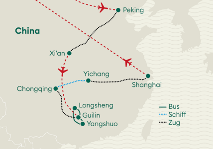Fahrt nach Guilin – ca. 90 km, ca. 2 Stunden Zugfahrt von Guilin nach Chongqing – ca. 800 km, ca. 5-6 Stunden