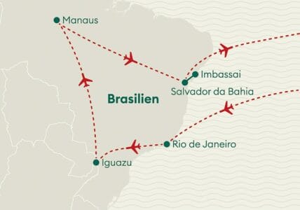 Hinweis Abreisetermine 14.09.25 und 03.10.25: Die Badepause verkürzt sich um einen Tag, dafür erleben Sie eine weitere Nacht im magischen Amazonas. Die Badepause findet abweichend in Praia do Fort statt Imbassai statt. Ihr genaues Reiseprogramm erhalten Sie mit den Reiseunterlagen.
